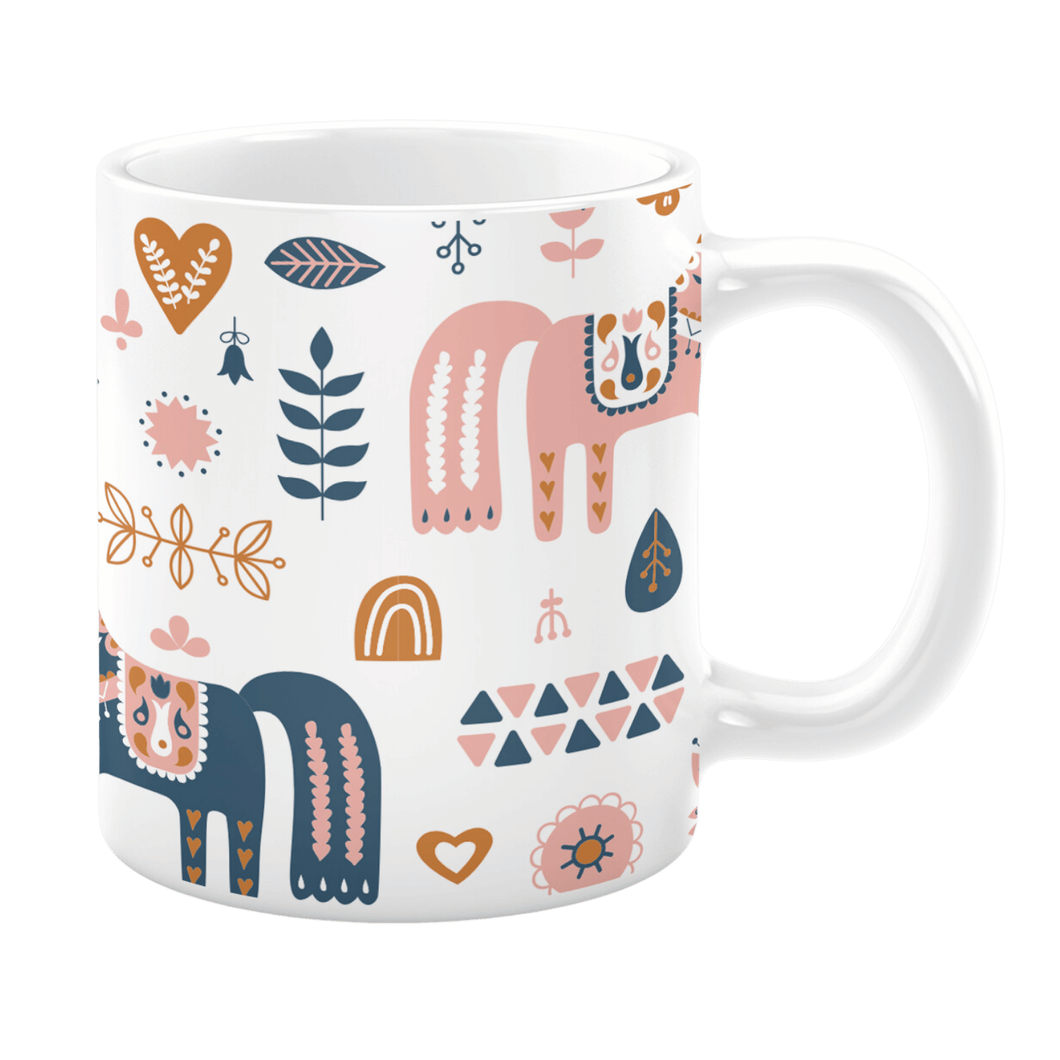 This ceramic mug showcases a beautifully intricate Scandinavian folk-art-inspired design featuring stylized horses in soft pink and navy tones. Surrounded by delicate botanical elements, hearts, and geometric shapes, this pattern brings a charming and whimsical touch to your daily coffee or tea routine. Perfect for lovers of Nordic and boho aesthetics, this mug adds a cozy and artistic flair to any setting.