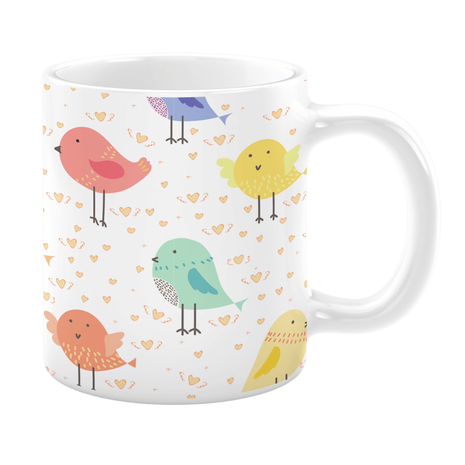 Start your day with a touch of charm and cheer with this adorable ceramic mug featuring a whimsical bird design. The delightful pattern showcases a variety of cute, colorful birds in shades of yellow, blue, green, and peach, surrounded by tiny heart accents on a crisp white background. Perfect for bird lovers, nature enthusiasts, or anyone who enjoys playful and artistic designs, this mug adds a fun and heartwarming touch to your morning coffee or tea. Whether at home or in the office, this mug is sure to bring a smile with every sip!