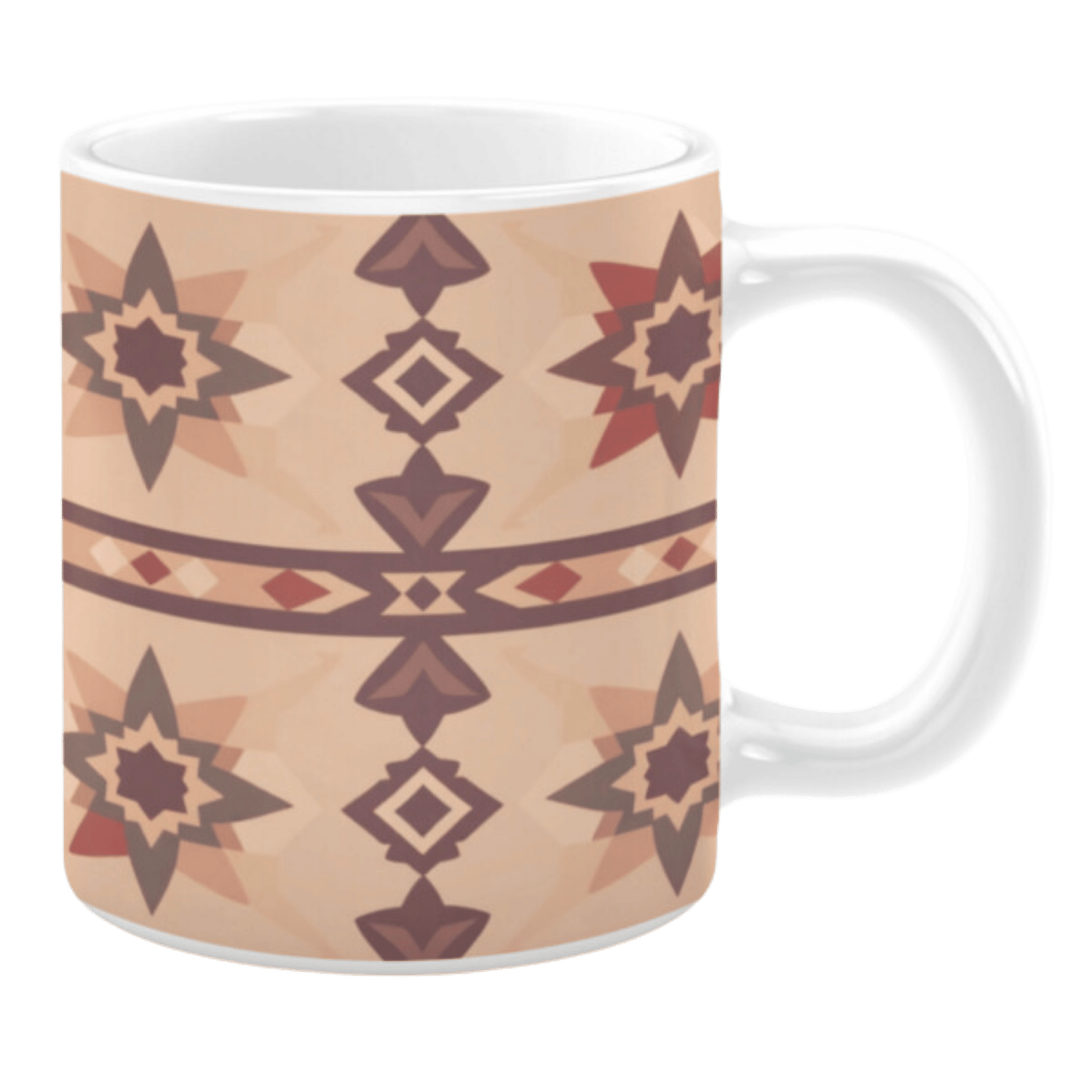 This ceramic mug features an elegant southwestern-inspired pattern in warm beige, brown, and muted red. The intricate geometric details evoke the charm of traditional desert motifs, creating a cozy and stylish aesthetic. Perfect for morning coffee or evening tea, this mug adds a subtle rustic touch to your daily routine.