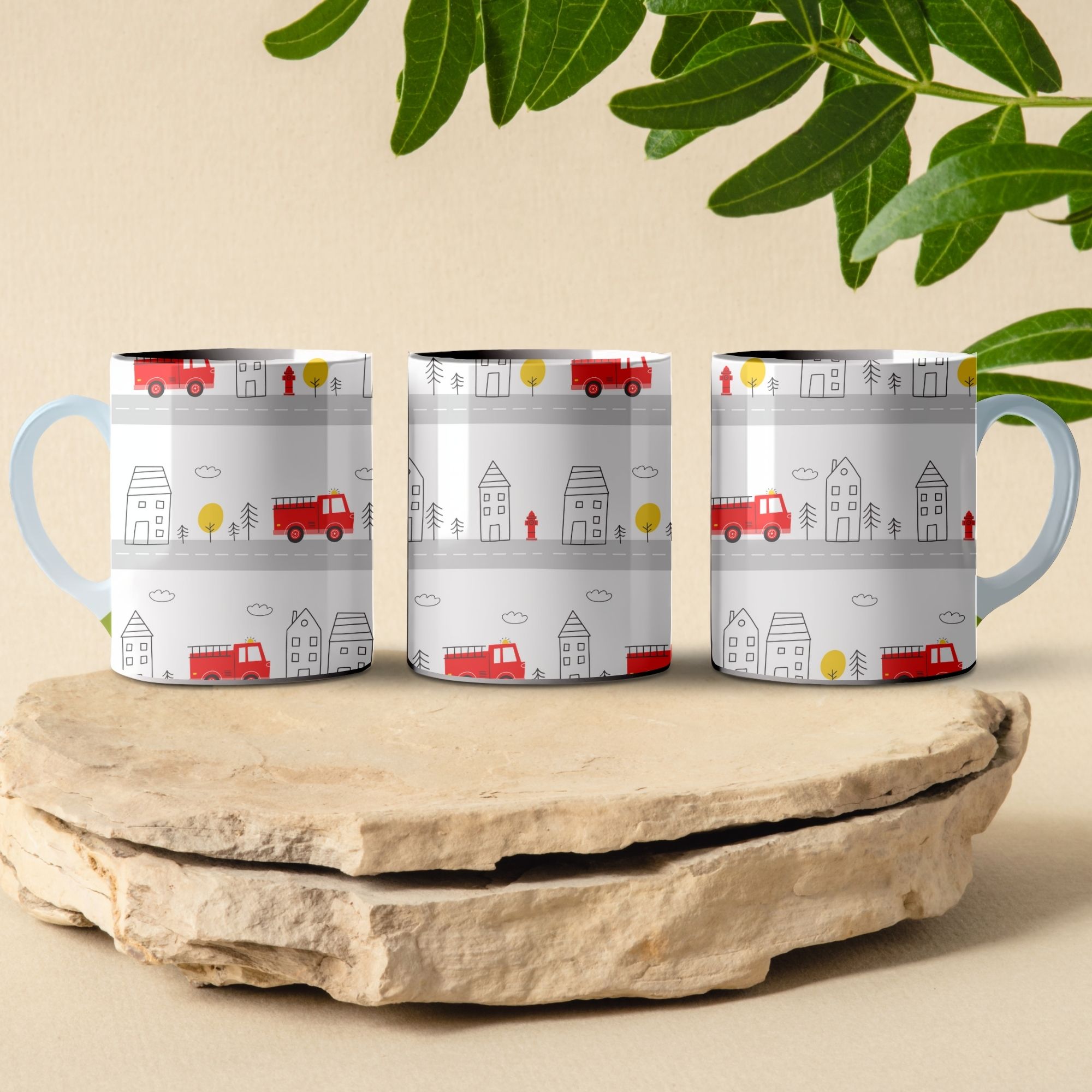 Ceramic mug with a charming fire truck and cityscape design