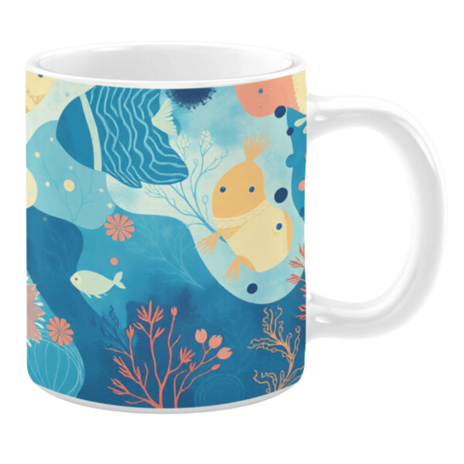 Dive into a world of charm with this delightful ceramic mug, featuring a dreamy underwater illustration in soft blues, warm golds, and coral pinks. Playful fish swim among delicate sea plants, creating a serene and whimsical oceanic landscape. The gentle waves and intricate botanical details bring a sense of calm and wonder, making this mug perfect for adding a peaceful touch to your coffee or tea routine. Whether you’re starting your day or enjoying a relaxing moment, this beautifully illustrated design invites you to escape into a tranquil marine world with every sip.