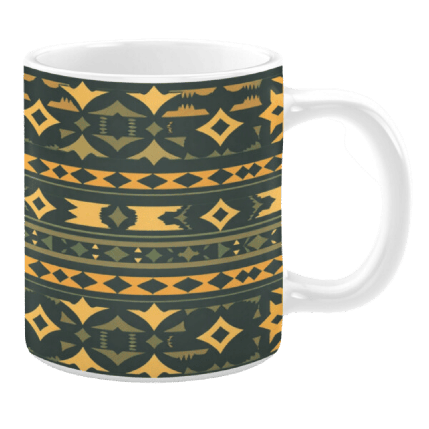 Embrace the spirit of the Southwest with this ceramic mug, featuring a striking geometric pattern in deep forest green and golden hues. The layered design evokes traditional woven textiles, making it a stylish and rustic addition to your coffee or tea routine.