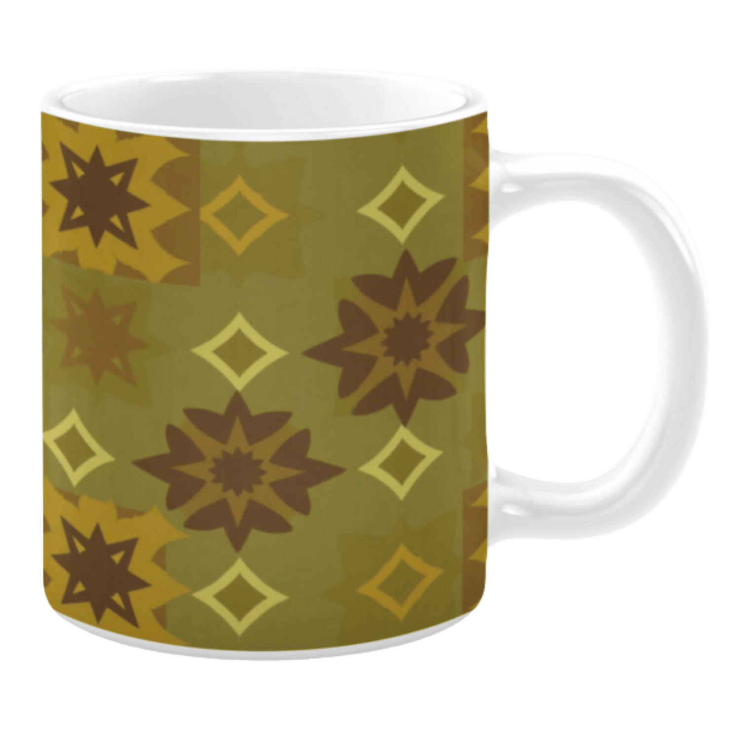 Embrace a warm and natural aesthetic with this ceramic mug, featuring a geometric star pattern in rich shades of olive green, deep brown, and golden hues. Inspired by traditional motifs, the symmetrical design creates a cozy, rustic feel, perfect for nature lovers and those who appreciate timeless patterns. Whether enjoying your morning coffee or unwinding with tea, this mug adds a touch of organic charm to your daily routine.
