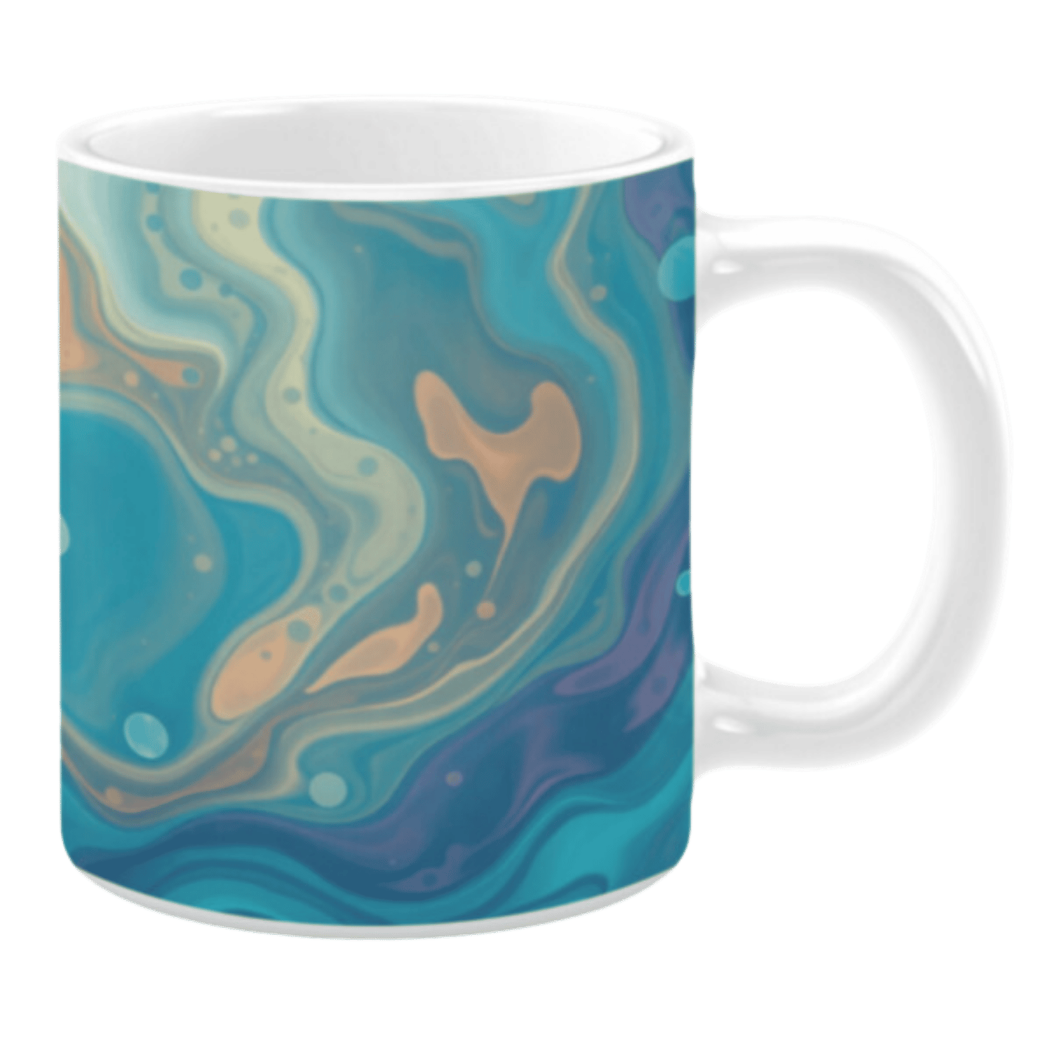 Immerse yourself in the beauty of fluid motion with this ceramic mug, featuring a mesmerizing swirl of deep blues, teals, and sandy golds. The design mimics the natural flow of ocean waves meeting the shore, evoking a sense of calm and movement. Perfect for those who appreciate abstract art and coastal aesthetics, this mug brings a touch of serene elegance to your coffee or tea moments.