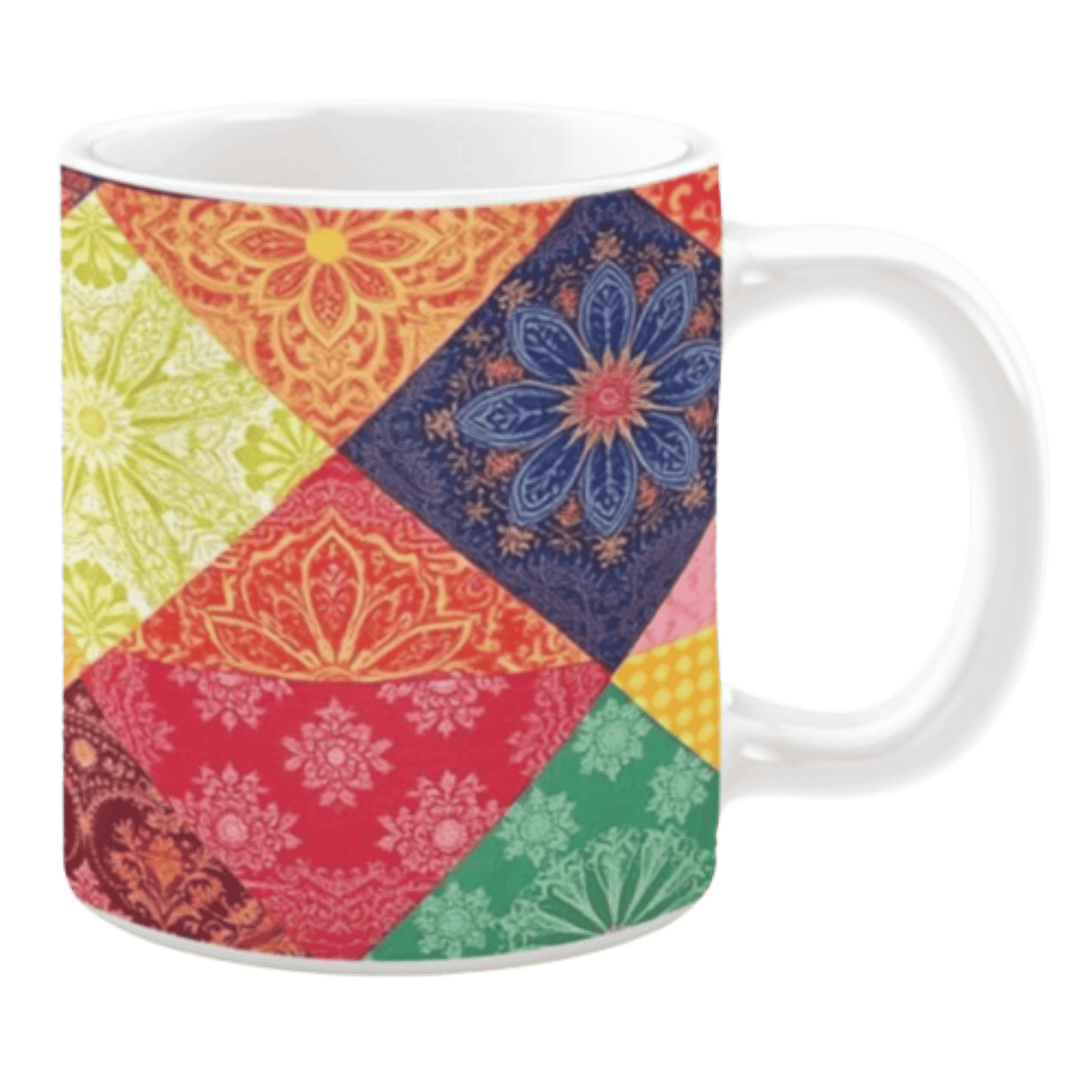 Add a touch of elegance to your coffee or tea routine with this beautifully detailed ceramic mug, featuring a luxurious patchwork quilt pattern in deep reds, golden yellows, royal blues, and lush greens. Each patch is adorned with intricate floral motifs and delicate mandala-inspired details, creating a sophisticated and timeless aesthetic. The harmonious blend of colors and textures evokes the charm of handcrafted textiles, making this mug a perfect choice for those who appreciate vintage-inspired artistry. Whether at home or in the office, this stunning mug brings warmth and refinement to every sip.