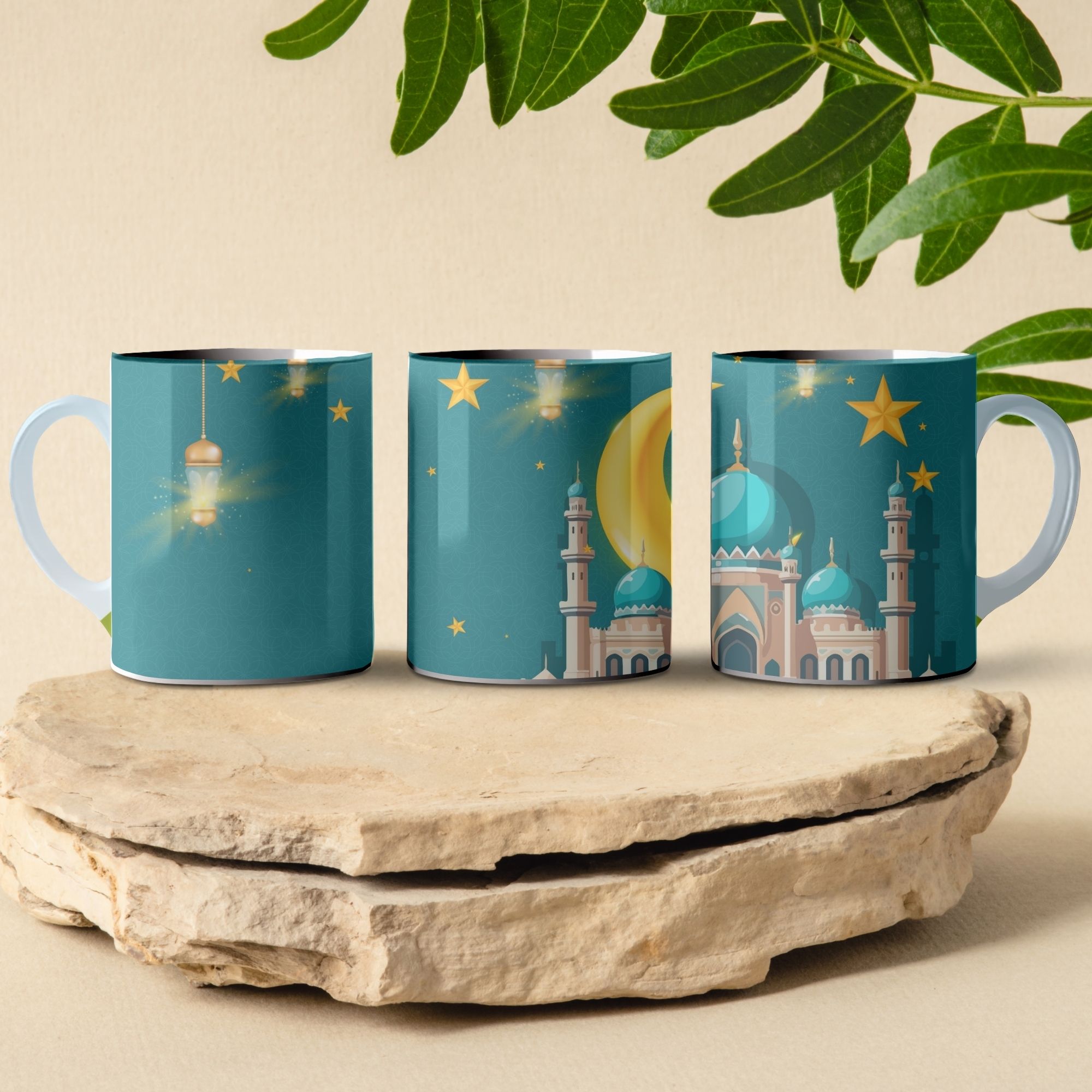 Celebrate the beauty of tradition with this elegantly designed ceramic mug. Showcasing a stunning illustration of an ornate mosque beneath a glowing crescent moon and shimmering stars, this mug brings a sense of serenity and spiritual inspiration to your daily routine. The intricate details, warm golden hues, and soft teal backdrop create a peaceful and uplifting aesthetic. Crafted from high-quality ceramic, this mug is perfect for enjoying your favorite beverages while reflecting on moments of peace and gratitude. Ideal for personal use or as a meaningful gift, it’s a beautiful addition to any collection.