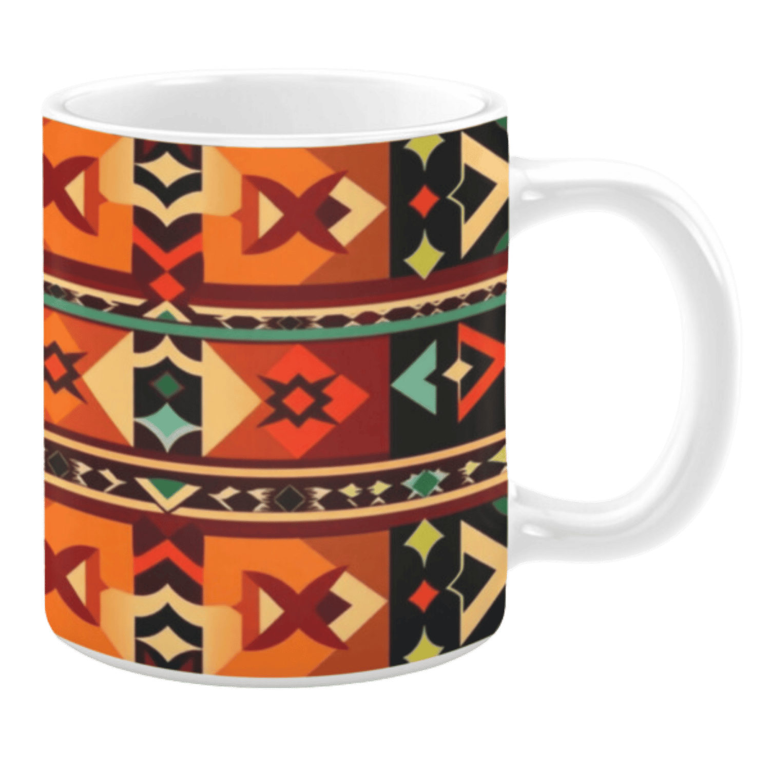 This ceramic mug showcases a dynamic southwestern design, featuring geometric patterns in striking shades of red, orange, black, and beige. Accented with intricate detailing and traditional motifs, this mug adds a rustic and adventurous flair to your daily coffee or tea ritual.