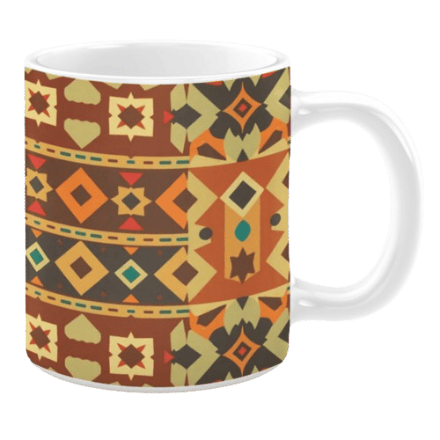 Elevate your coffee or tea time with this striking ceramic mug, adorned with an intricate tribal-inspired geometric design. Featuring deep browns, burnt oranges, and muted golds, this pattern blends traditional southwestern and indigenous motifs, creating a rich and warm aesthetic. The detailed symmetrical layout, accented with subtle teal highlights, gives this mug a unique character. Perfect for adding a rustic and artistic touch to your daily routine, this mug is both stylish and functional.