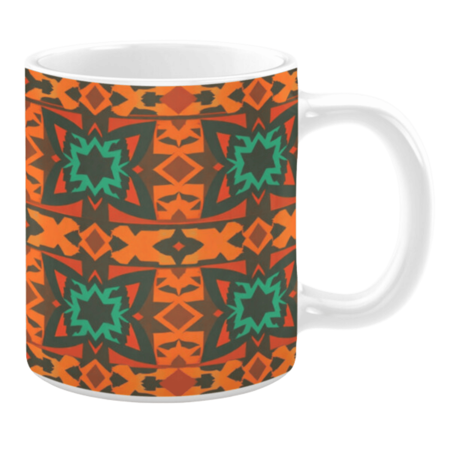 Add a touch of cultural flair to your coffee routine with this ceramic mug, featuring an intricate geometric tribal design in rich oranges, deep greens, and warm browns. The symmetrical pattern creates a dynamic and eye-catching aesthetic, evoking a sense of tradition and artistry. Perfect for those who appreciate bold designs and earthy color palettes, this mug brings warmth and character to every sip.