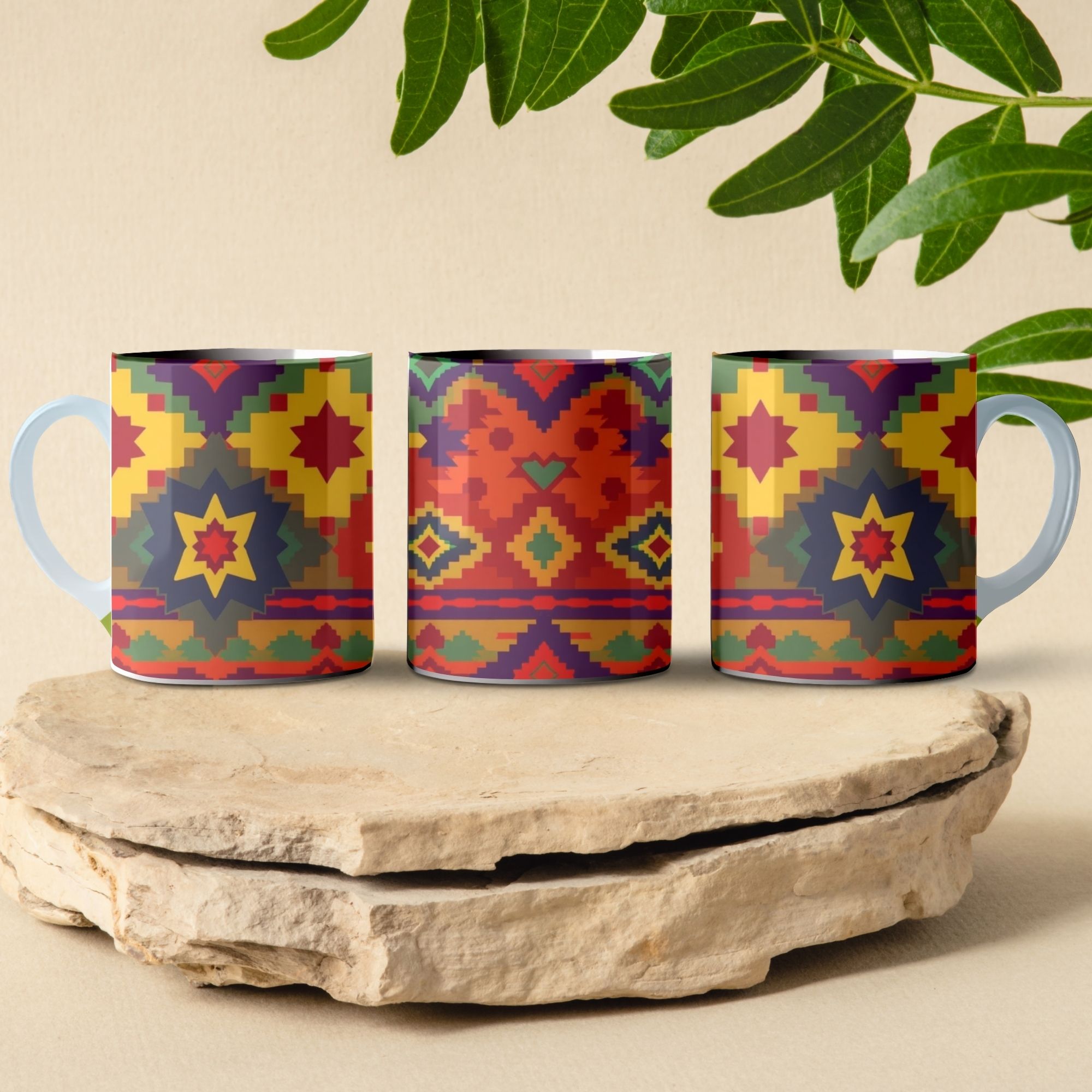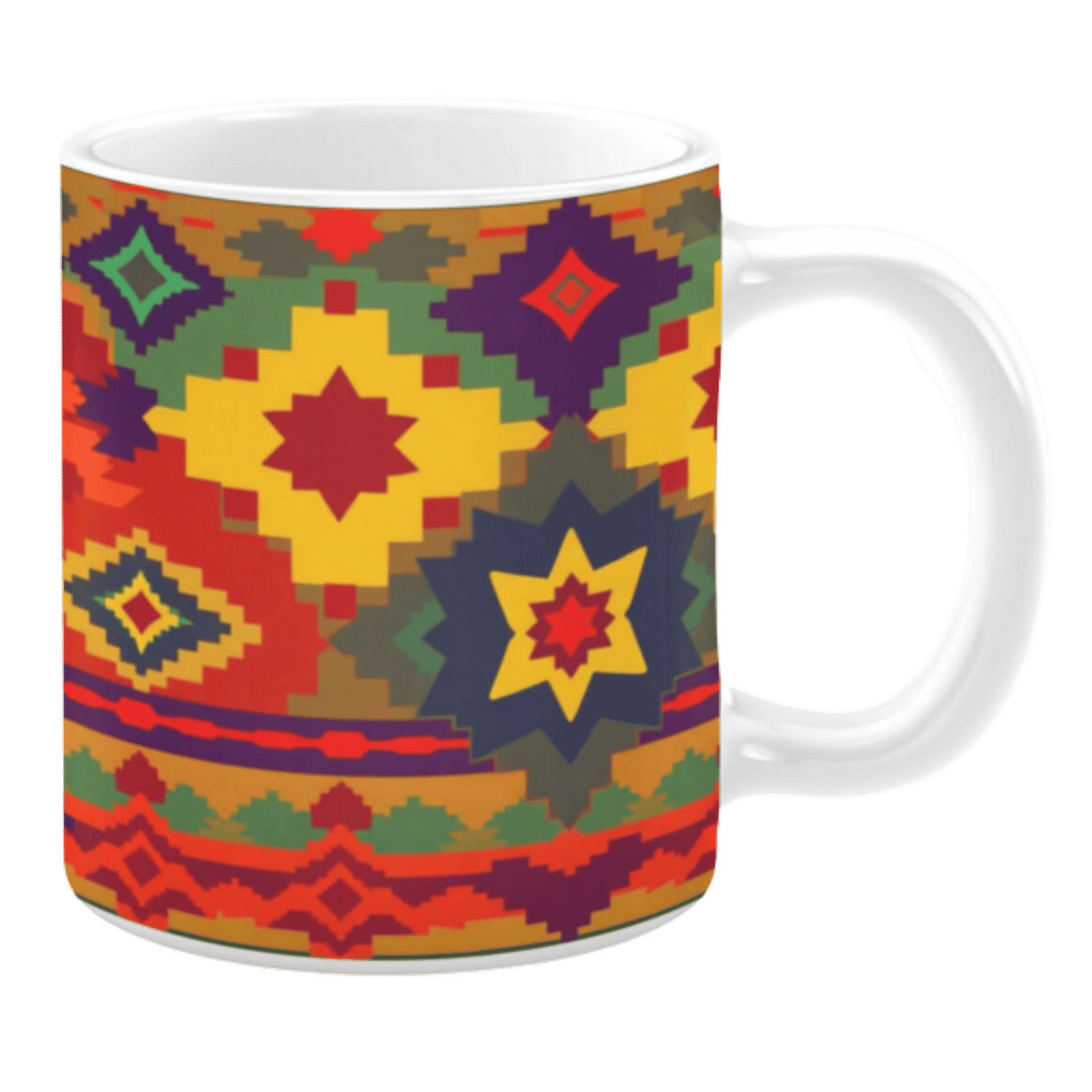Add a bold and colorful touch to your coffee routine with this ceramic mug, featuring a striking Southwestern starburst pattern. The dynamic design showcases rich hues of red, yellow, deep green, and purple, woven together in intricate geometric shapes that echo traditional tribal textiles. The layered star motifs and diamond patterns create a sense of depth and movement, making this mug a true statement piece. Perfect for those who love bold patterns and cultural artistry, this mug brings warmth, vibrancy, and a touch of Southwestern charm to every sip.