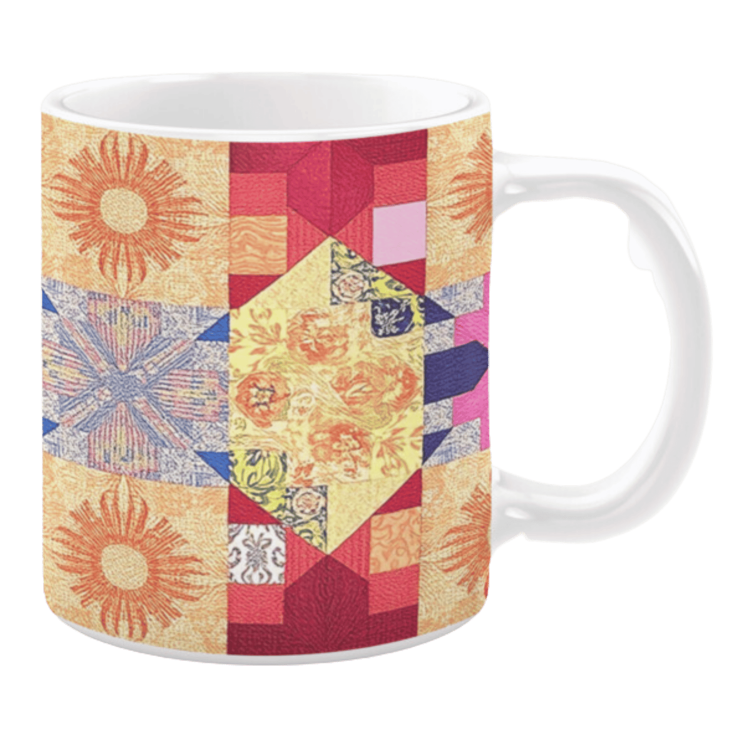 Wrap your hands around a cozy blend of color and tradition with this ceramic mug, featuring a beautifully detailed patchwork quilt pattern. The design showcases a mix of warm reds, golden yellows, soft blues, and intricate floral accents, creating a charming handcrafted aesthetic. Inspired by classic quilt artistry, this mug adds a nostalgic yet vibrant touch to your coffee or tea routine. Whether you’re starting your morning or unwinding in the evening, this delightful design brings comfort, warmth, and a splash of color to every sip.
